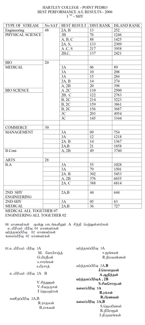 This is the 2006 G.C.E (A/L) Examination Results for Hartley College. Please note that only the names of those who secured a university admission are recorded here.