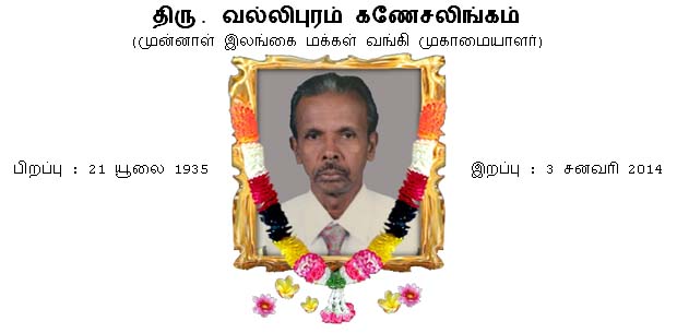 Mr.Vallipuram Ganeshalingam was the Father-in-law of Anuratha Rajmohan, Basil Gnanaraj and Jeyagowery Murugathas and the beloved grandfather of Jeyani, Pragathan and Ooviya