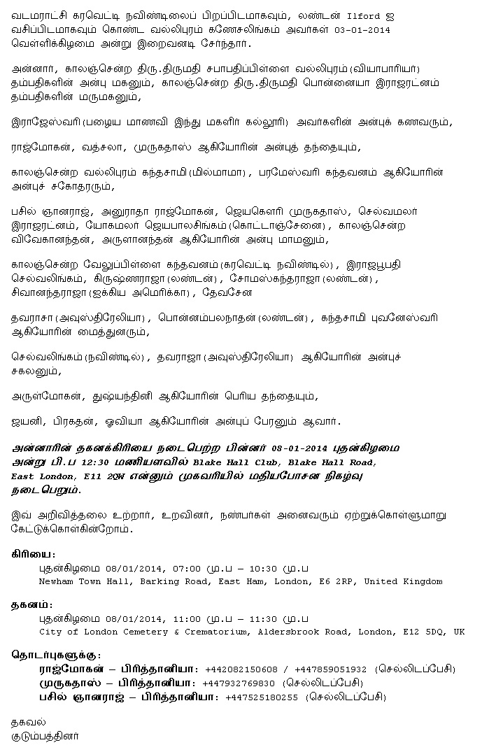 Mr. Vallipuram Ganeshalingam was a retired manager of People.s bank, native of Vadamarachy Karaveddi Navindel and a resident of Ilford (London)