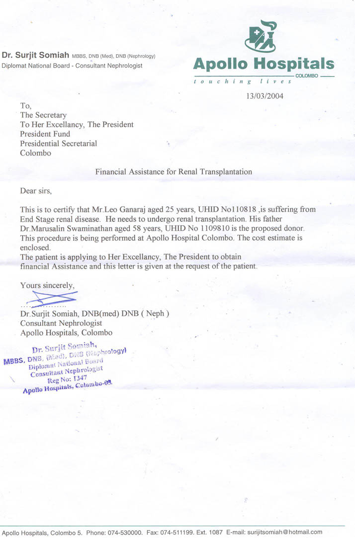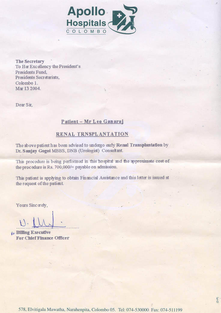 *As of March 05th 2004, Mr. S. Leo Arul Gnanaraj, is still in National Hospital of Colombo. His operation is expected to be carried out in Apollo Hospital most probably next week (The date is not fixed yet). Every day his blood is transfused and if he was admitted to private hospital the cost would have been Rs 40000.00 per day for the transfusion only. 90% of the testing on his father has been completed in Apollo Hospital to transfer his kidney to Leo Arul Gnanaraj.